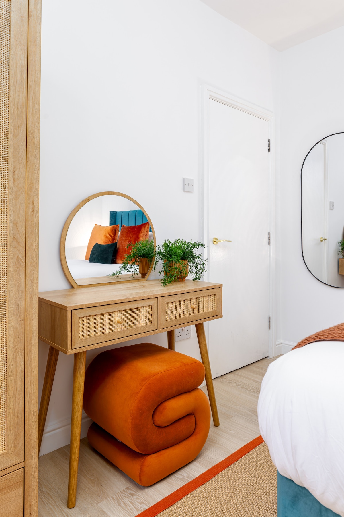 Bedroom 2 offers a comfortable double bed and work desk with contemporary fixtures and fittings.