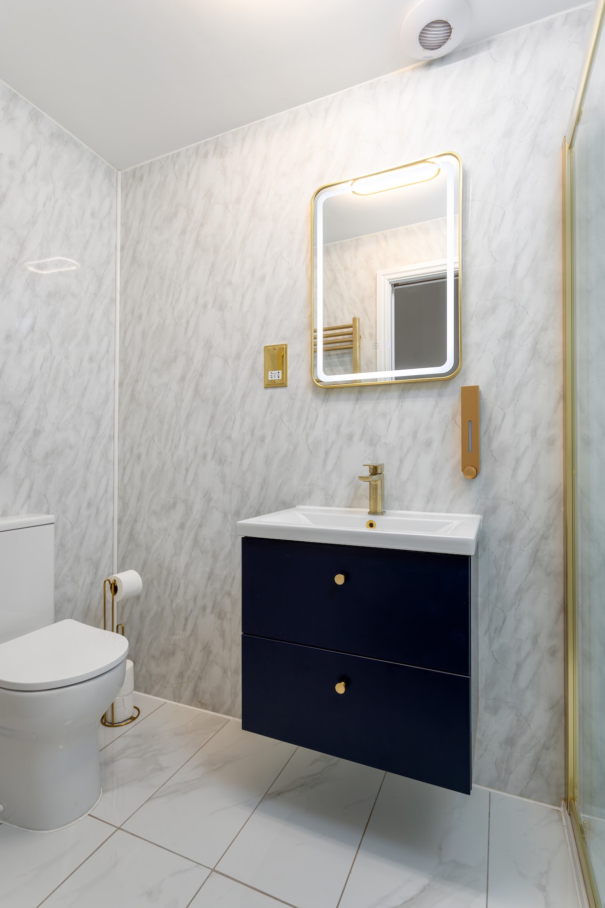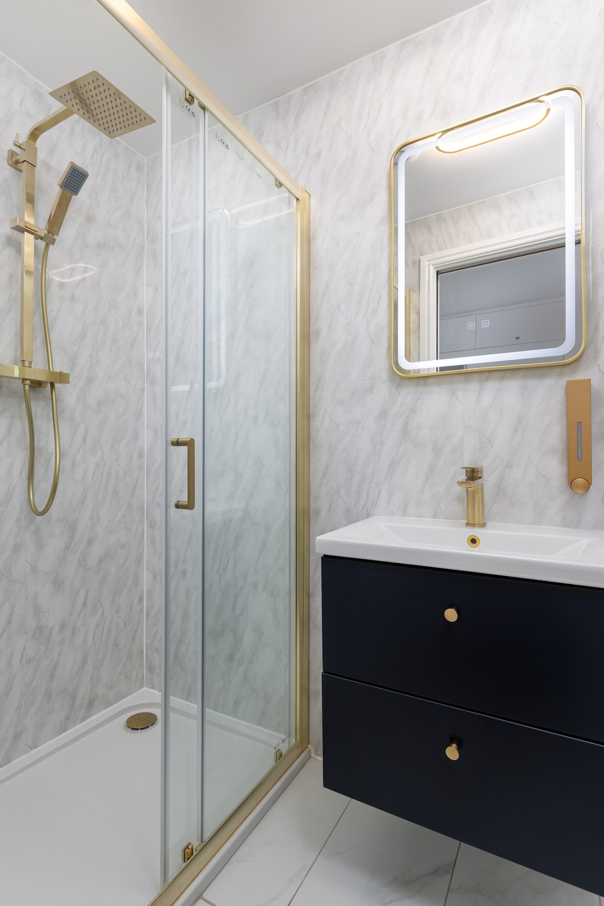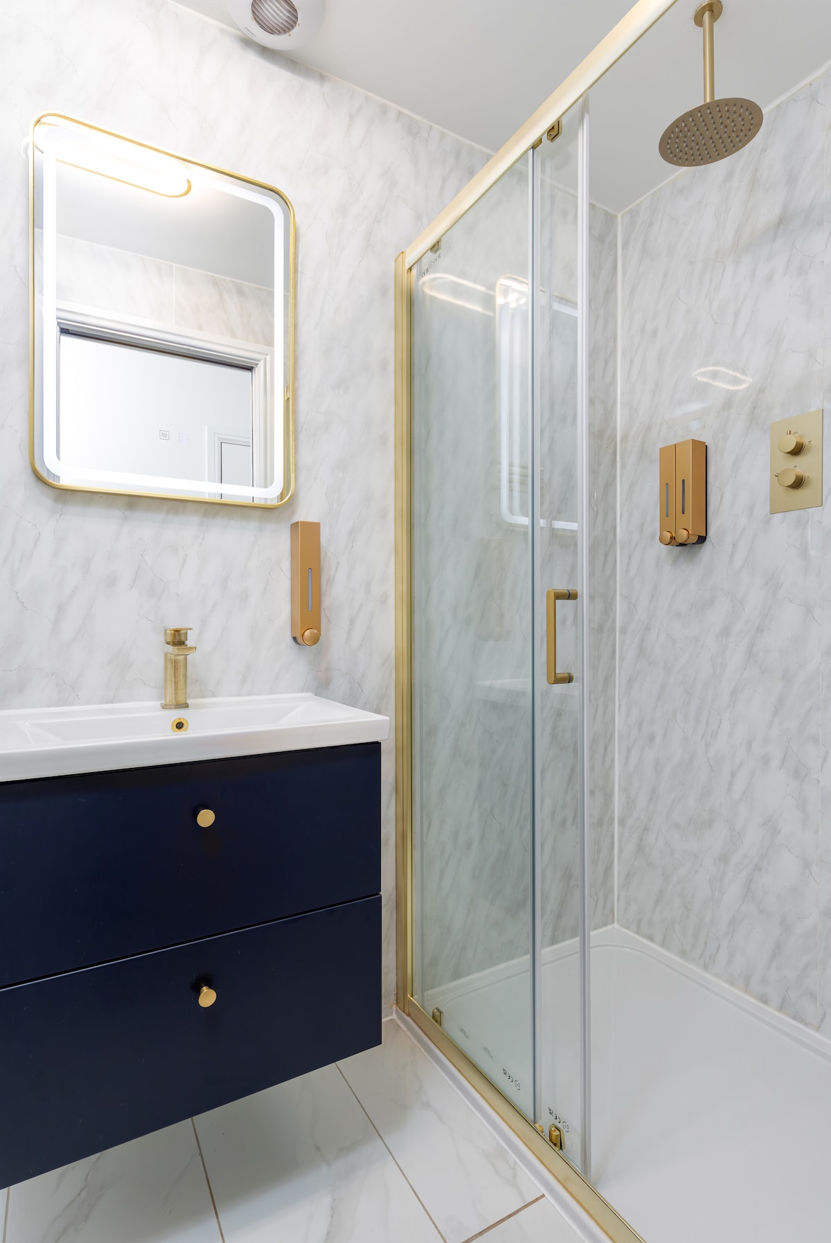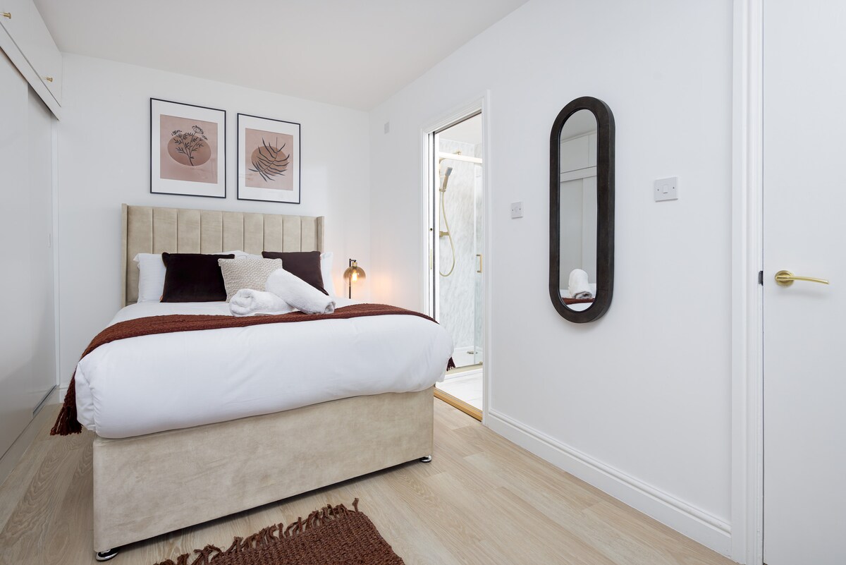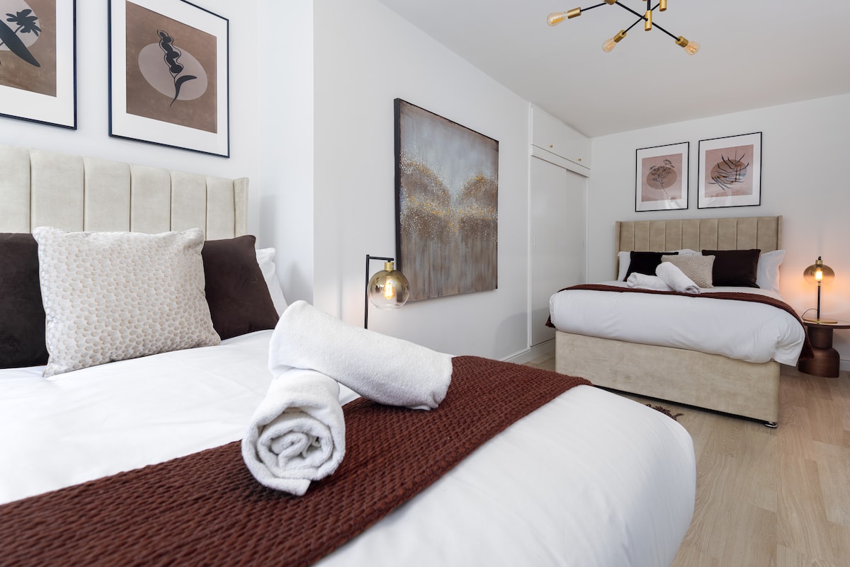 Bedroom 1 features two double beds and a modern en-suite bathroom with a spacious, contemporary design.