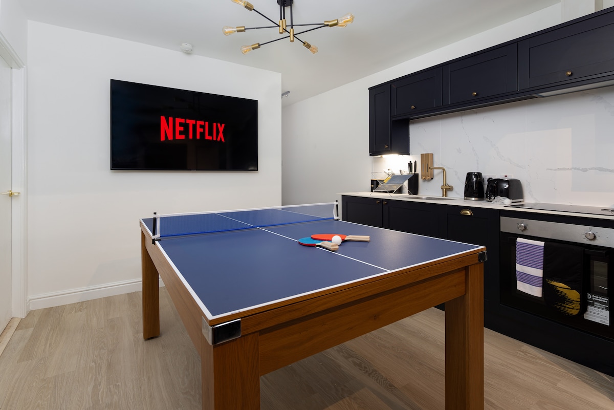Relax in the comfortable living room with a cozy sofa and large flat-screen TV featuring streaming services. The ping-pong table adds extra entertainment - perfect for unwinding with friends and family after exploring the city.